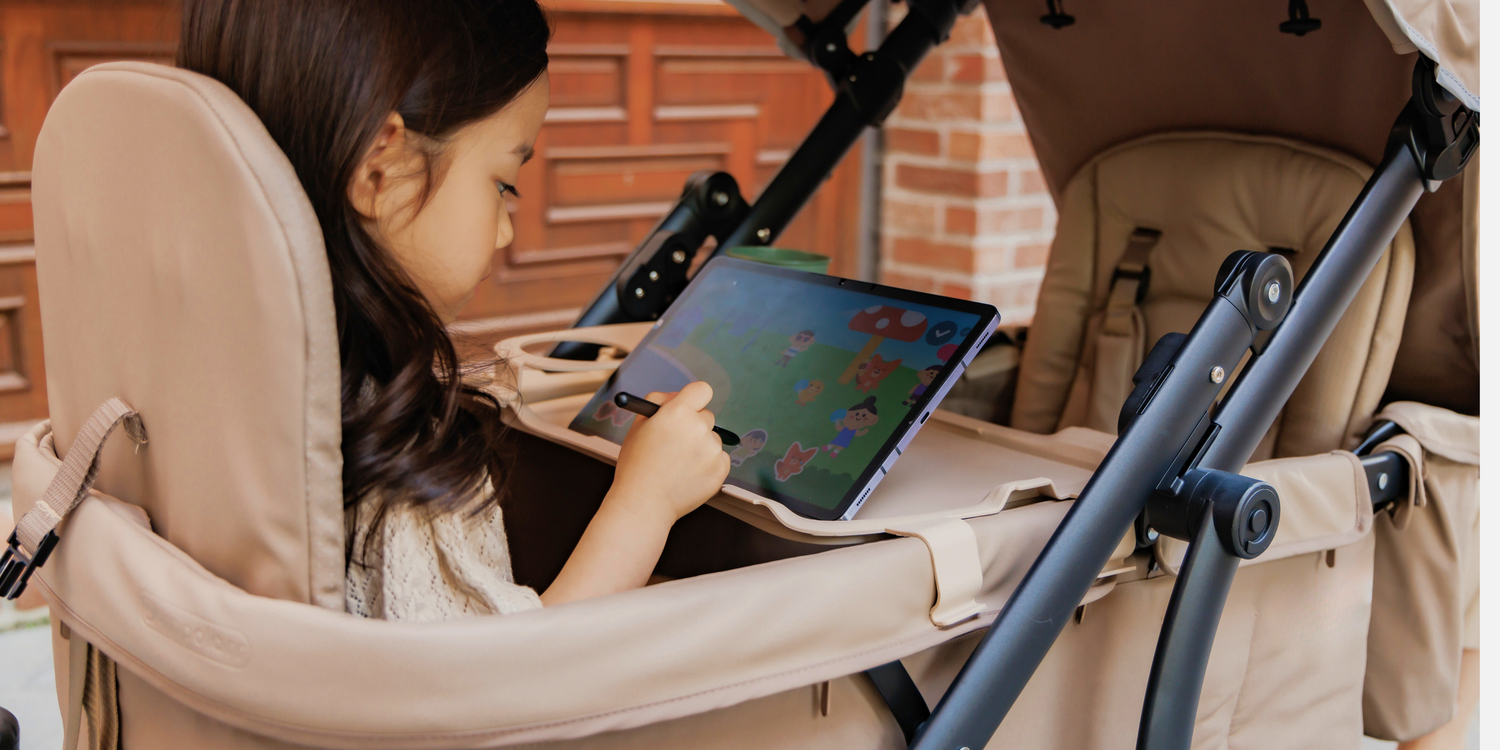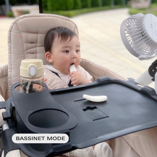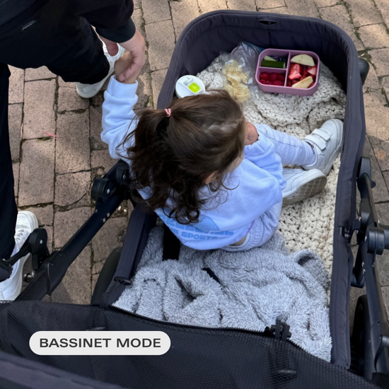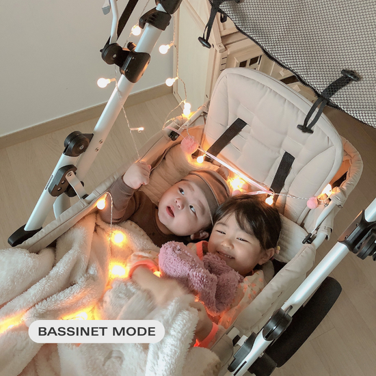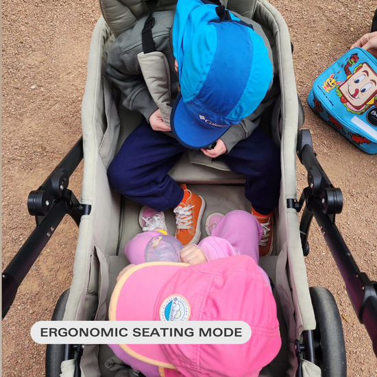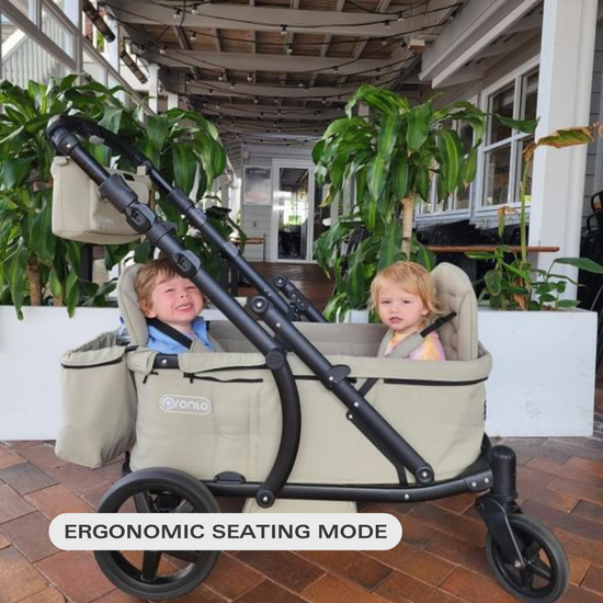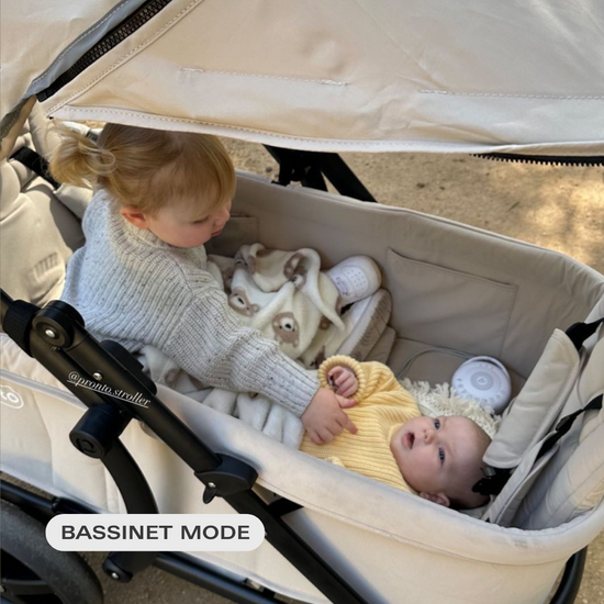 Pronto includes two-full sized toddler seats with adjustable harnesses that can adjust in size for both your tiny baby and your toddler. Our seats are removable and pronto features the option to switch in seconds from bassinet to supportive 90 degree seating for your children. Our seats are designed from 6 months. Your toddler can still sit in the stroller while the bassinet function is activated.