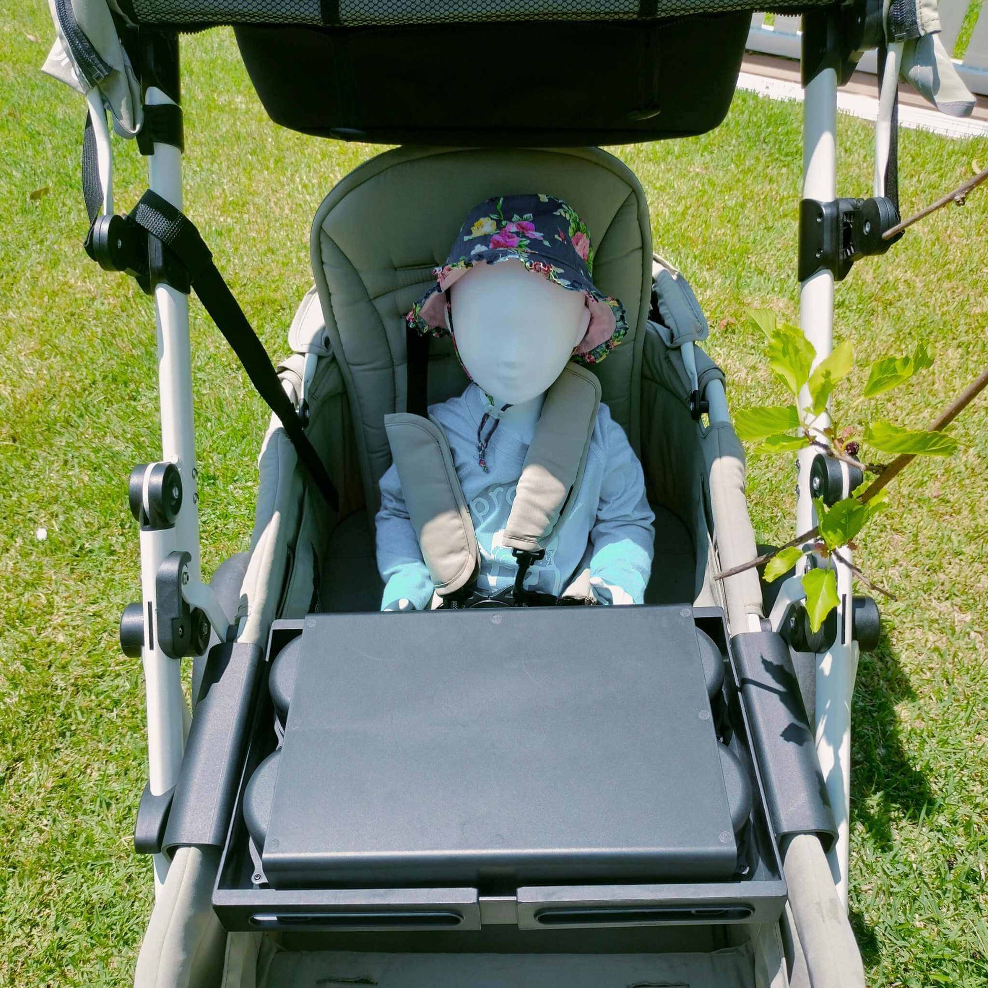 The tray is reversible so you can flip it over for a smooth, flat surface, perfect for drawing, colouring, or other activities on the go. It attaches easily without any tools, making it simple to install or remove. This tray helps keep everything organised and makes stroller trips more fun for both kids and parents.
